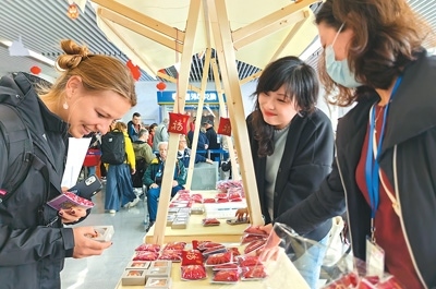 外國游客在“非遺彝繡秀北京”活動期間體驗佩戴彝繡工藝品。翁奇羽攝(人民視覺)