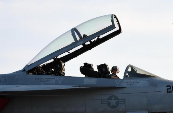 2017年7月22日,在美國弗吉尼亞州諾??撕\娀?,飛行員坐在“福特”號航母上的F/A-18戰(zhàn)斗機中。新華社記者殷博古攝