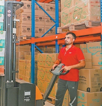 工作人員在位于阿聯(lián)酋迪拜的極兔速遞海外倉內(nèi)搬運(yùn)貨物。本報(bào)記者 任皓宇攝