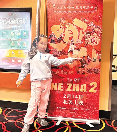 圖為唐夢竹的女兒在美國洛杉磯一家影院的《哪吒之魔童鬧海》宣傳海報前留影。