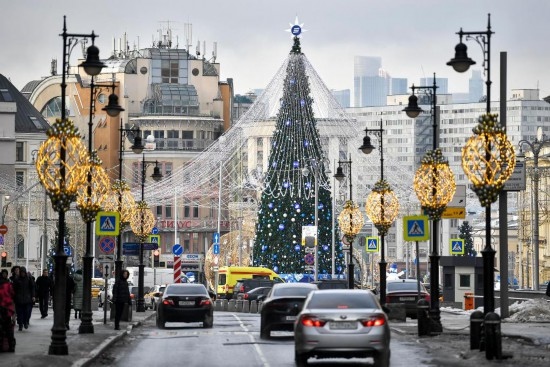 2023年12月22日,在俄羅斯首都莫斯科,車(chē)輛從新年樅樹(shù)附近駛過(guò)。新華社發(fā)(亞歷山大攝)