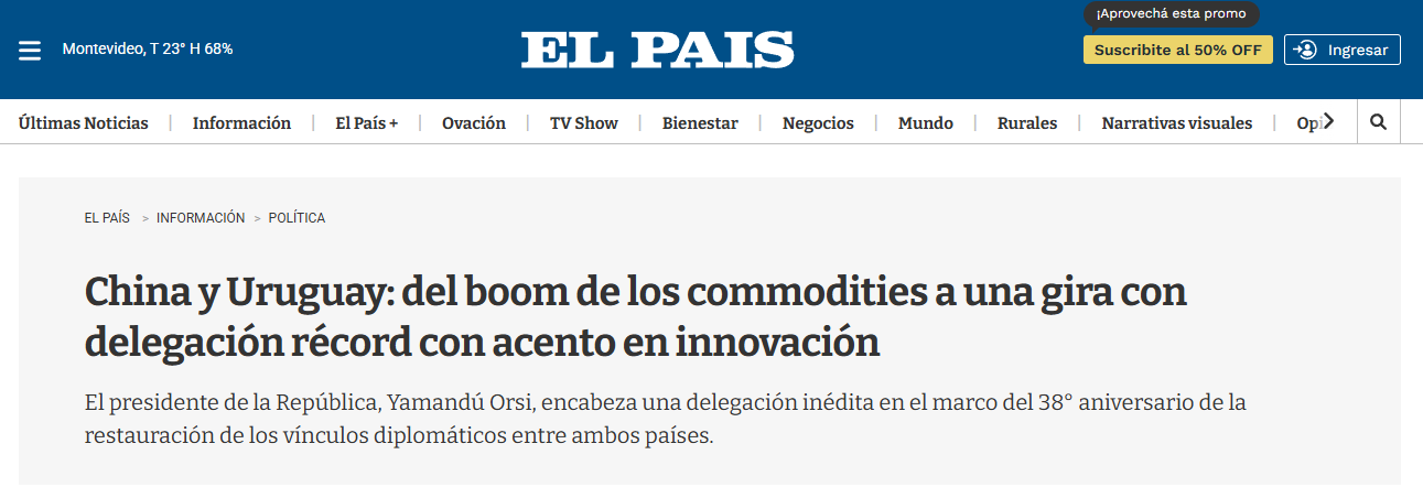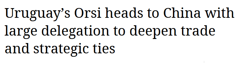 南美新聞機(jī)構(gòu)Merco Press報道稱,此次訪問正值烏拉圭與中國建交38周年,烏拉圭總統(tǒng)奧爾西率領(lǐng)約150人的代表團(tuán)啟程訪華,旨在“加強(qiáng)與烏拉圭最大貿(mào)易伙伴之間的經(jīng)濟(jì)聯(lián)系”。