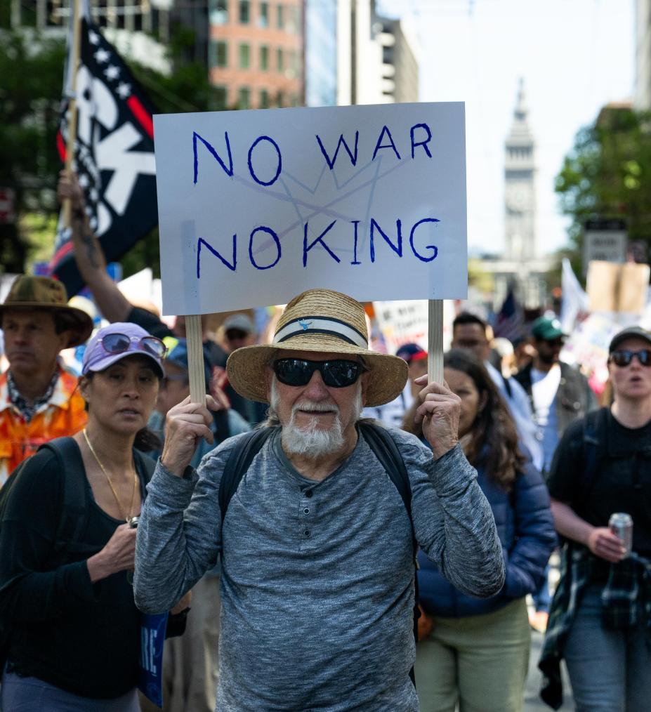 3月28日,人們在美國加利福尼亞州舊金山參加“不要國王”抗議活動(dòng)。新華社發(fā)(朱子于攝)