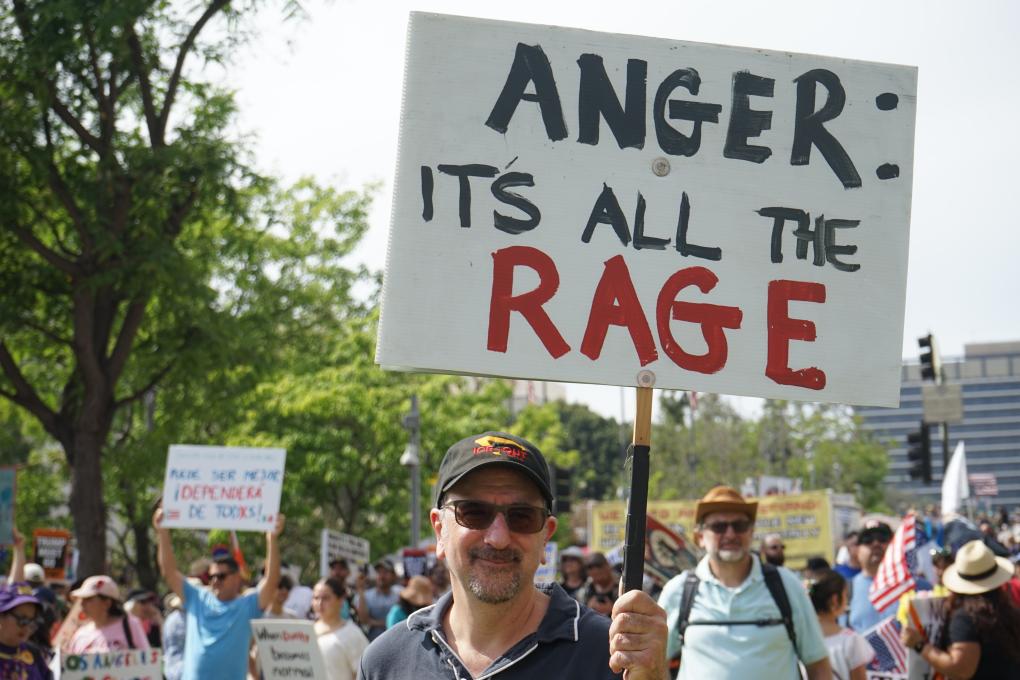 3月28日,人們在美國加利福尼亞州洛杉磯參加“不要國王”抗議活動(dòng)。新華社發(fā)(曾慧攝)