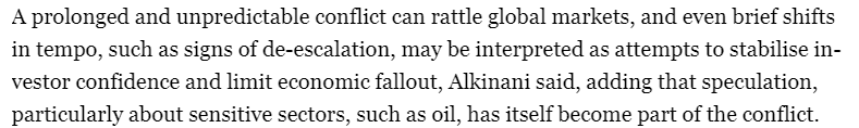 一名研究中東地區(qū)的金融分析師澤頓·阿爾基納尼(Zeidon Alkinani)告訴半島電視臺(tái),曠日持久且難以預(yù)測的沖突會(huì)動(dòng)搖全球金融市場的信心,即使是短暫的節(jié)奏變化,例如局勢緩和的跡象,也可能被解讀為試圖穩(wěn)定投資者信心和限制經(jīng)濟(jì)損失。阿爾基納尼強(qiáng)調(diào),“投機(jī)行為,特別是對(duì)石油等敏感行業(yè)的投機(jī)行為,本身也已成為沖突的一部分?!?/p>