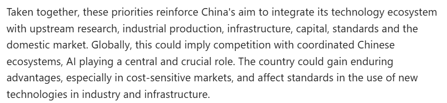 文章進一步分析說,這些優(yōu)先事項強化了中國將其技術(shù)生態(tài)系統(tǒng)與上游研究、工業(yè)生產(chǎn)、基礎(chǔ)設(shè)施、資本、標準及國內(nèi)市場相融合的目標。對全球而言,這意味著未來將面對一個高度協(xié)同的中國技術(shù)生態(tài)系統(tǒng),而人工智能將是這一系統(tǒng)的中樞。中國由此可能獲得持久的競爭優(yōu)勢,同時也會在工業(yè)及基礎(chǔ)設(shè)施的新技術(shù)應(yīng)用標準方面發(fā)揮越來越大的影響力。