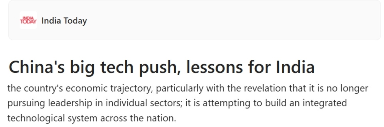 《今日印度》網(wǎng)站近日刊文稱,中國近期通過的“十五五”規(guī)劃綱要為下階段發(fā)展指明了方向。其中引人注目的是,規(guī)劃綱要不再追求在單一領(lǐng)域取得領(lǐng)先地位,而是試圖構(gòu)建全國一體化的技術(shù)體系。