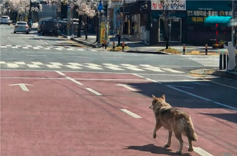 當(dāng)?shù)貢r(shí)間4月8日,大田消防部門提供的照片顯示,這匹在逃狼在大街上行走。圖源:韓媒