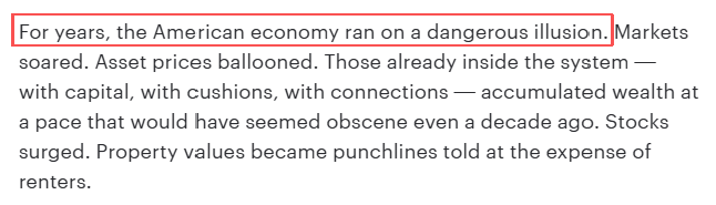 文章分析指出,美國經(jīng)濟多年來一直建立在危險的幻覺之上。市場呈現(xiàn)虛假繁榮,資產(chǎn)價格不斷膨脹。那些掌握資本和人脈資源的既得利益者,正以驚人的速度積累財富。與此同時,普通民眾卻要面對生活成本的持續(xù)攀升:食品價格從緩慢上漲到快速飆升,房租成為每月必須面對的生存考驗,信用卡從救急工具變成了新的債務(wù)陷阱。美國中產(chǎn)階級正面臨前所未有的生存壓力,階層滑落的風險遠大于上升機會。
