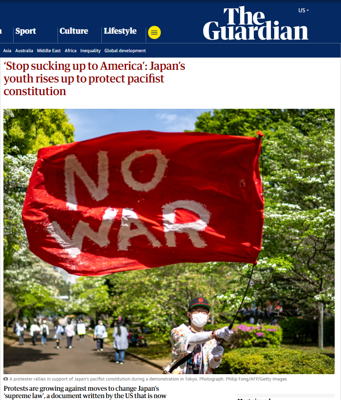 日本首相高市早苗關于修憲的相關表態(tài)引發(fā)廣泛質疑和反對。英國《衛(wèi)報》刊發(fā)題為《“停止對美國阿諛奉承”:日本青年奮起捍衛(wèi)和平憲法》的文章,文中稱,反對修改日本和平憲法的抗議活動日益高漲,越來越多日本年輕人正成為這場反對修憲運動的中堅力量。