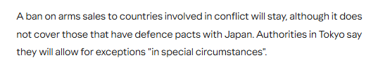 英國廣播公司刊文認為,日本放寬了實施數(shù)十年的武器出口限制,為向十余個國家出售武器鋪平了道路。這一決定,標志著日本背離其戰(zhàn)后防衛(wèi)政策中一貫的和平主義立場,是一個重要轉折點。