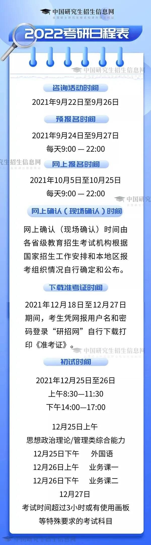根據(jù)《2022年全國碩士研究生招生工作管理規(guī)定》,2022年研考網(wǎng)上報名時間為2021年10月5日至10月25日。網(wǎng)上預報名時間為2021年9月24日至9月27日。