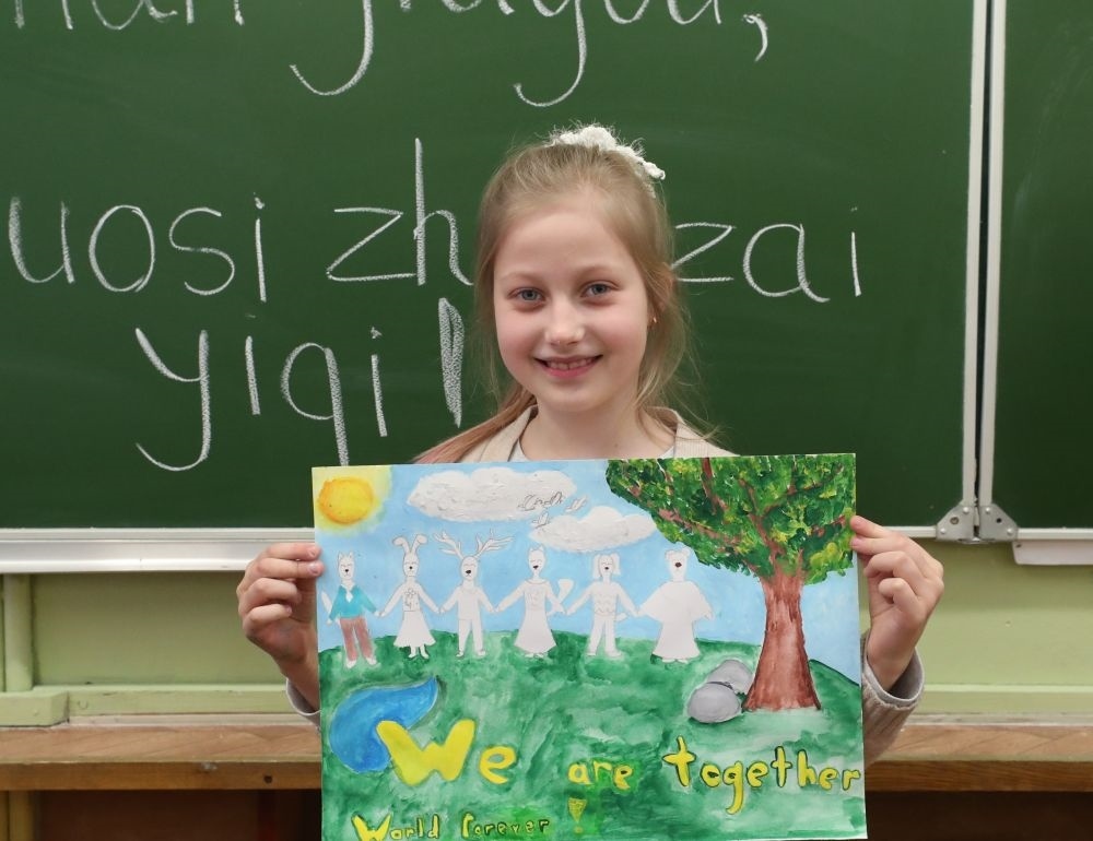 在白俄羅斯首都明斯克,一名小學(xué)生展示自己支持中國(guó)抗擊新冠肺炎疫情的繪畫作品。