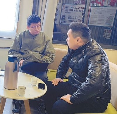 海南分社記者曹文軒(右)在海南省??趶团d城互聯(lián)網(wǎng)信息產(chǎn)業(yè)園黨群服務中心采訪。張余雪攝