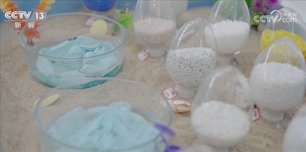 2020年海南以立法形式實(shí)施全域禁塑,在綠色消費(fèi)展臺(tái)可以看到不同顏色的全降解材料。左邊的這個(gè)器皿里裝的是剛剛放進(jìn)去的可降解塑料袋,右邊這個(gè)器皿展示的是它溶于水7天后的效果,現(xiàn)在已經(jīng)無(wú)法使用了,隨著時(shí)間的推移,最終可以完全變成二氧化碳和水。