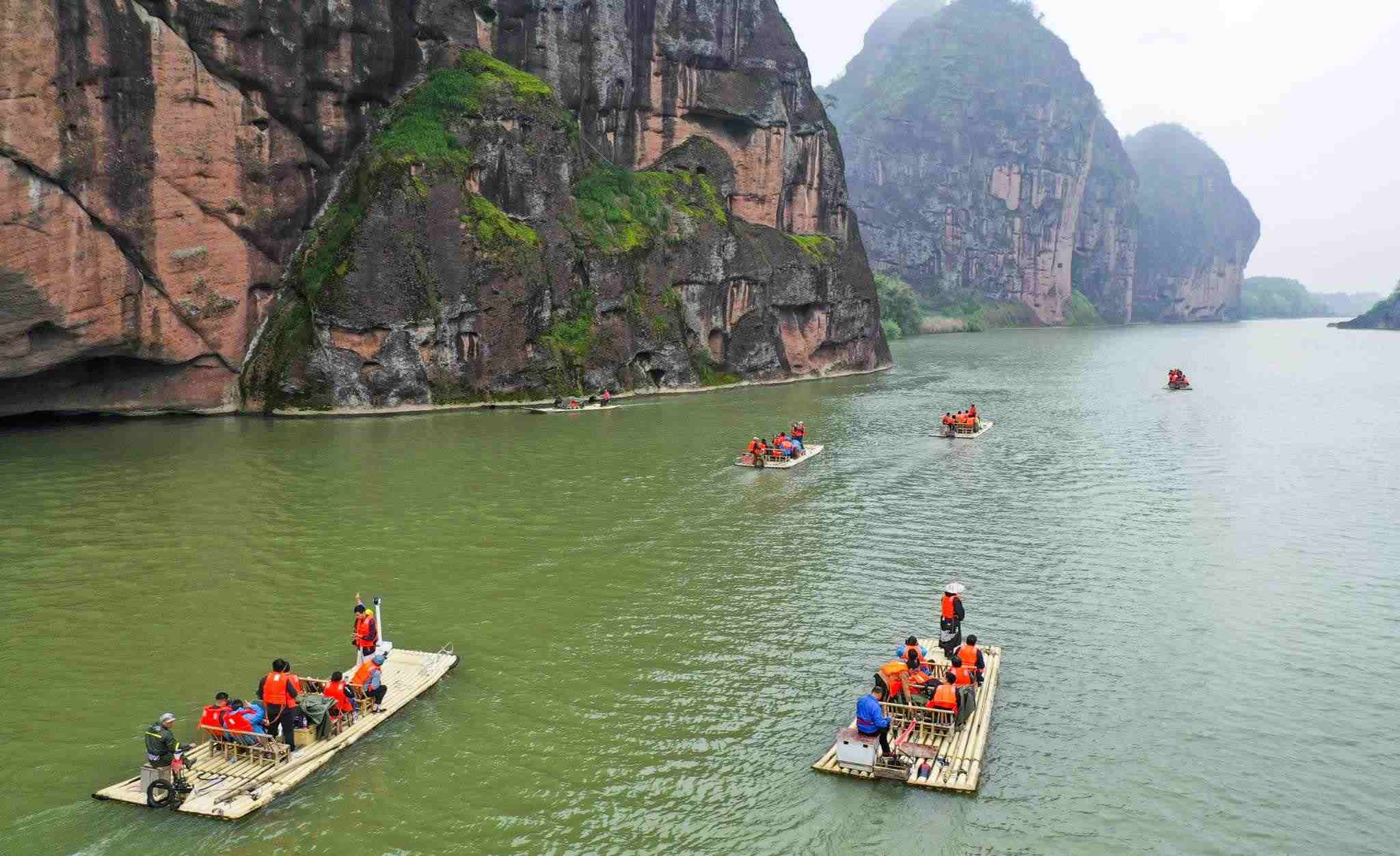 2023年4月13日,江西鷹潭,龍虎山景區(qū),游客們乘坐竹筏觀光賞景。視覺中國
