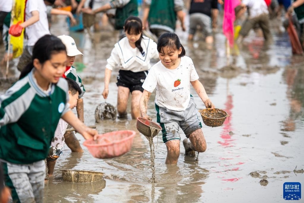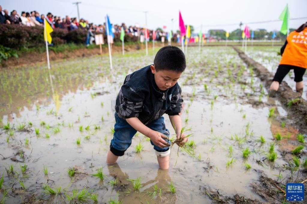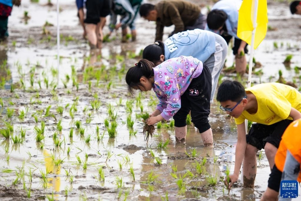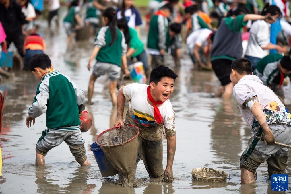 當(dāng)日,在湖南省長沙市寧鄉(xiāng)市灰湯鎮(zhèn)花果山村舉行的農(nóng)耕民俗文化節(jié)學(xué)生研學(xué)活動中,孩子們通過開展稻田插秧、捉泥鰍等“農(nóng)趣” 比賽,走進(jìn)田間地頭,感受勞動帶來的艱辛與快樂。新華社記者 陳思汗 攝