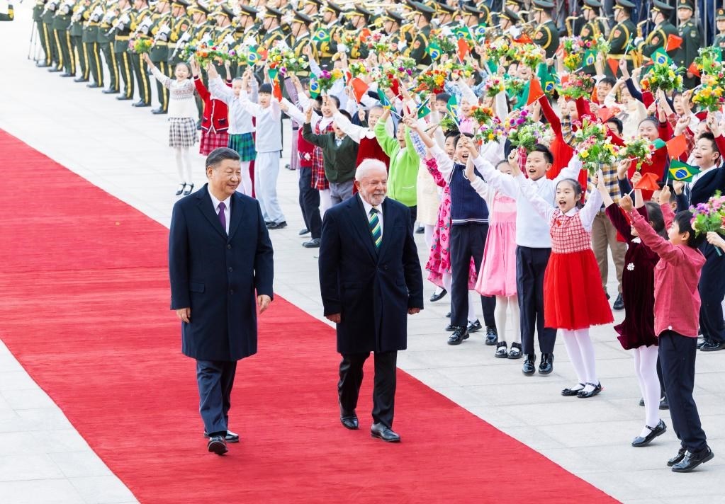 4月14日下午,國家主席習近平在北京人民大會堂同來華進行國事訪問的巴西總統(tǒng)盧拉舉行會談。這是會談前,習近平在人民大會堂東門外廣場為盧拉舉行歡迎儀式。新華社記者 黃敬文 攝