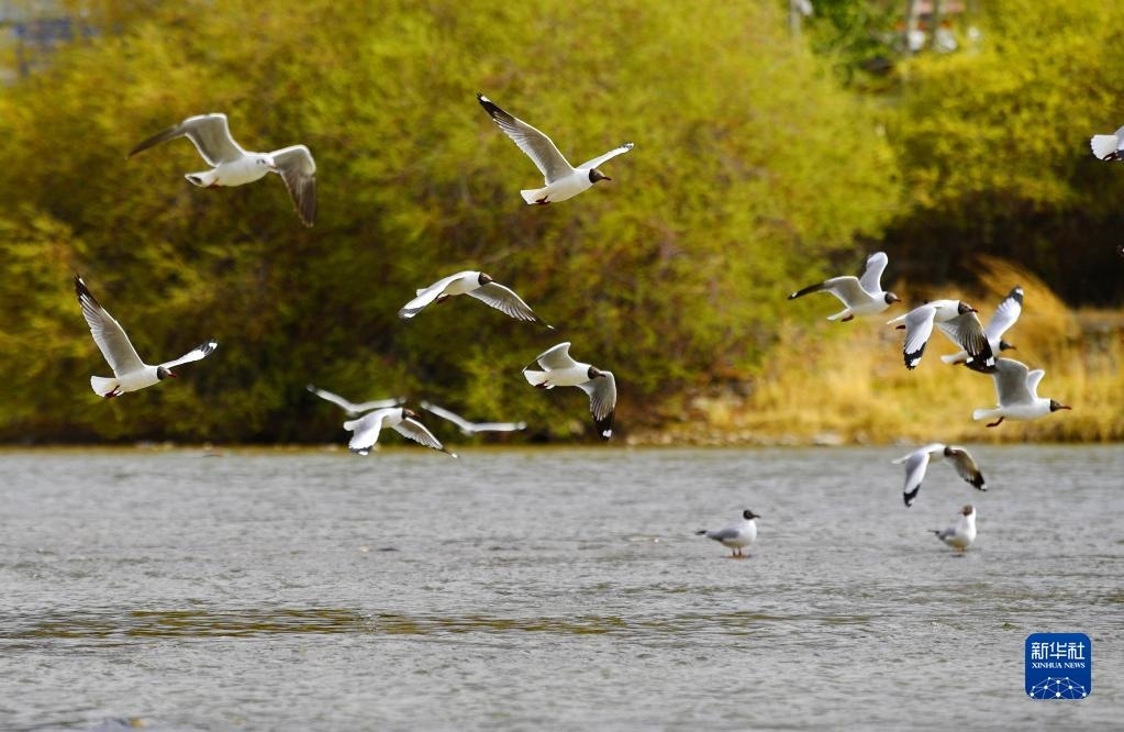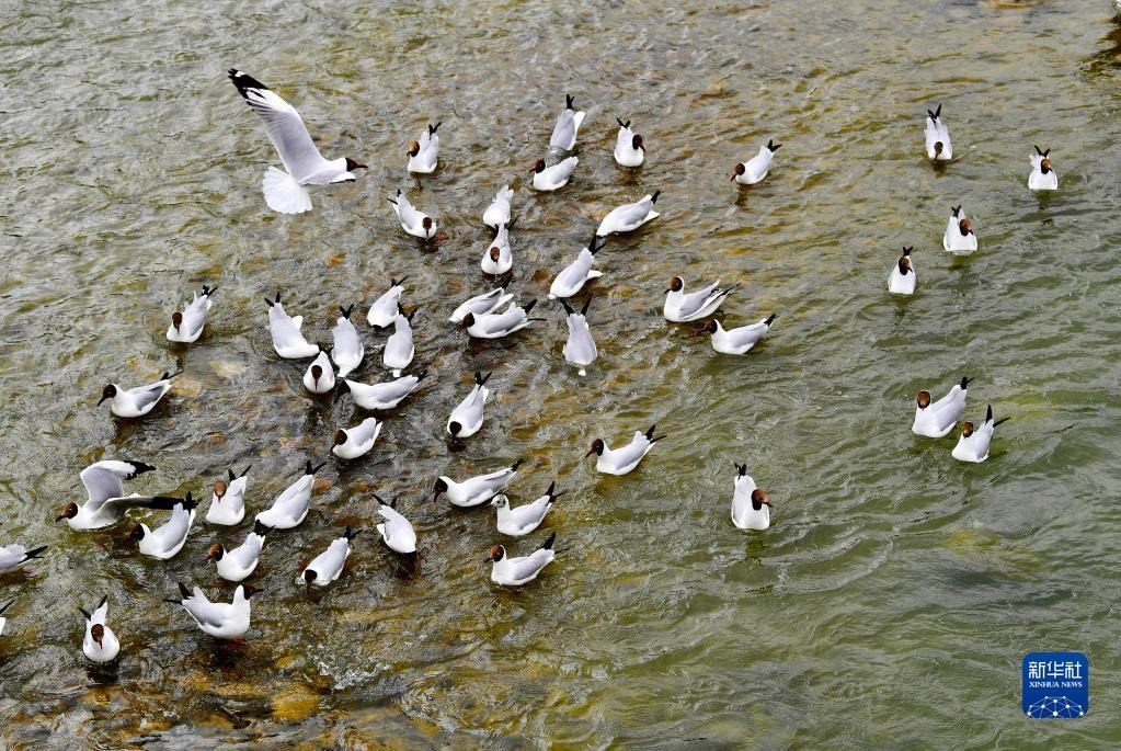拉薩河上的一群棕頭鷗(4月16日攝)。   新華社記者 張汝鋒 攝