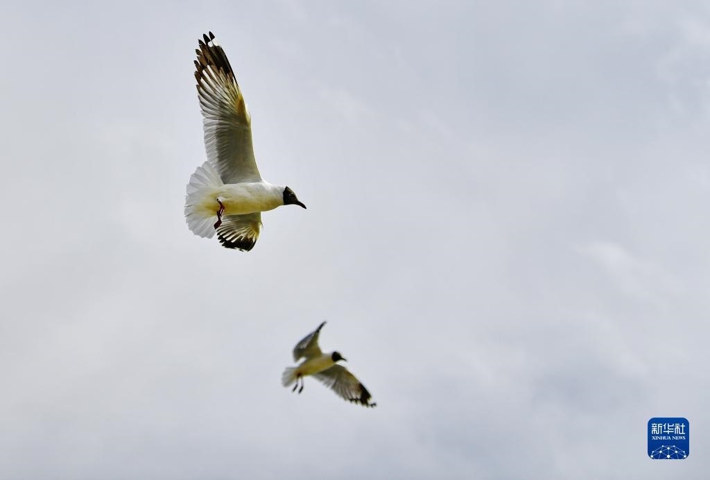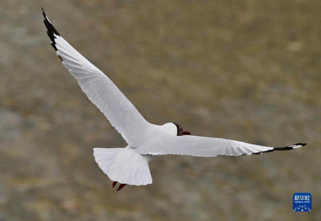 棕頭鷗在拉薩河上空飛翔(4月16日攝)。   新華社記者 張汝鋒 攝