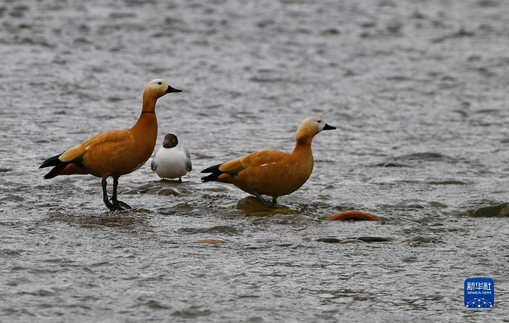 拉薩河上的赤麻鴨和棕頭鷗(4月16日攝)。   新華社記者 張汝鋒 攝