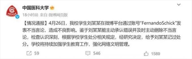 ·在本周中超聯(lián)賽的大連人vs成都蓉城的比賽后,兩隊(duì)的球迷出現(xiàn)了一些沖突。有球迷發(fā)現(xiàn)一名大學(xué)生在網(wǎng)上用5.12地震來(lái)攻擊刺激成都球迷,該生所屬中國(guó)醫(yī)科大學(xué)通報(bào),給予其記過(guò)處分。