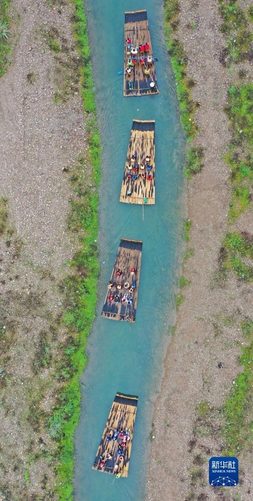4月29日,游客在浙江省臺州市仙居縣永安溪體驗生態(tài)竹筏漂流(無人機(jī)照片)。