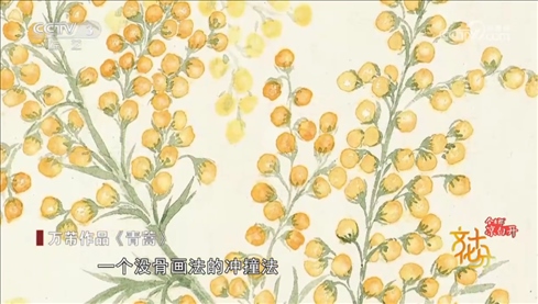 工筆花鳥畫家 上海市文史研究館館員 萬芾:我們看看這幅,這幅應(yīng)該我們很熟悉的一味中藥材就是人參,看了中藥這么美麗的花,這么有生命力的現(xiàn)象,是不是我們吃的時候也不苦了。