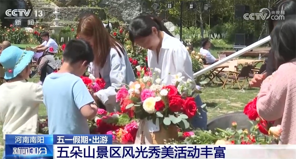 在河南南陽(yáng)市五朵山景區(qū),“五一”假期吸引了大批游客。今天上午,入園的游客就已經(jīng)超過(guò)了1萬(wàn)人。眼下正是南陽(yáng)月季博覽會(huì)召開(kāi)的時(shí)間,五朵山景區(qū)舉辦了一系列的賞花采風(fēng)活動(dòng),景區(qū)內(nèi)還組織了鄉(xiāng)村音樂(lè)節(jié)、漢服文化節(jié)和非遺民俗的表演,讓人們?cè)谛蕾p美麗的自然風(fēng)光之余,感受傳統(tǒng)文化的魅力。