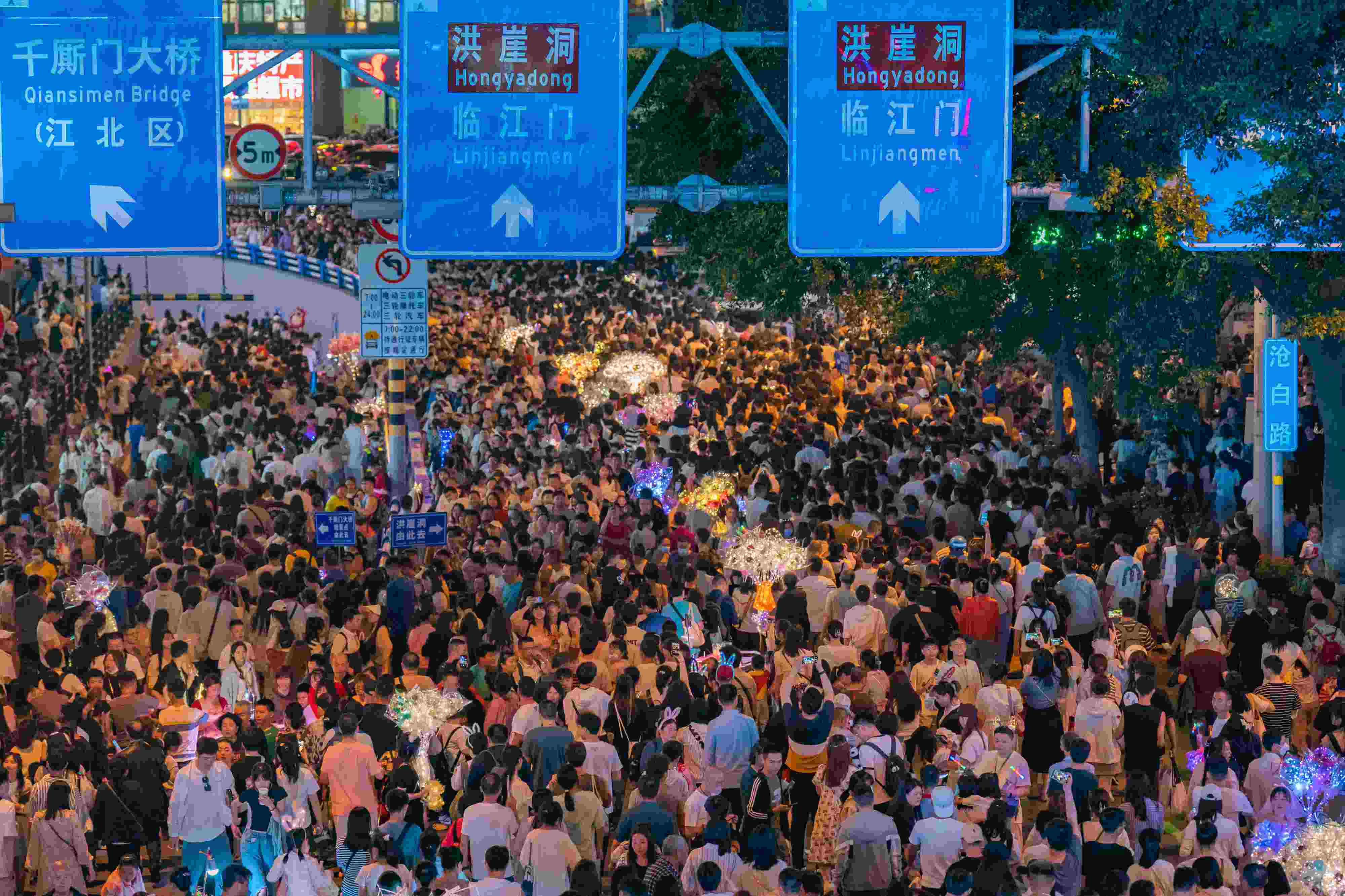 2023年4月30日,重慶,洪崖洞等熱門(mén)景點(diǎn)迎來(lái)游客高峰,千廝門(mén)大橋等多條主干道開(kāi)啟實(shí)行交通管制,方便游客出行。 視覺(jué)中國(guó)