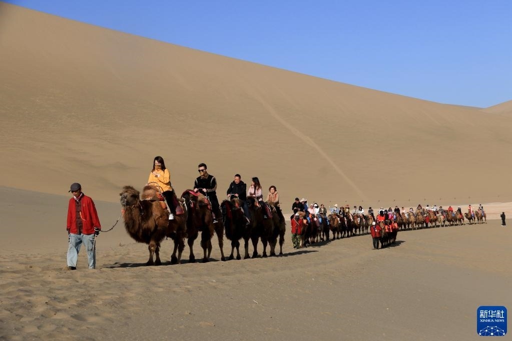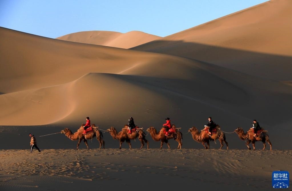 金色的鳴沙山上響起陣陣駝鈴聲,編號“414”的領頭駱駝和51歲的牽駝人曹文華一起帶領著駝隊,馱著游客,朝連綿起伏的沙丘深處走去。