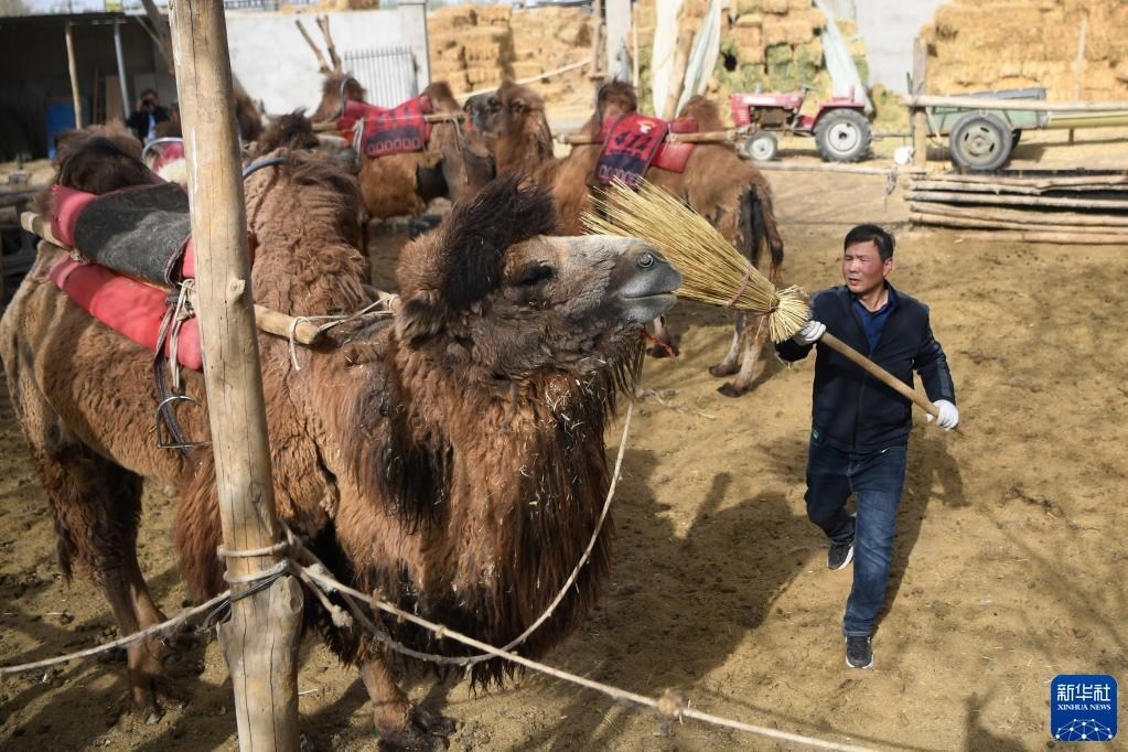曹文華在駝圈里打掃衛(wèi)生,為駱駝“上班”做準備(4月24日攝)。