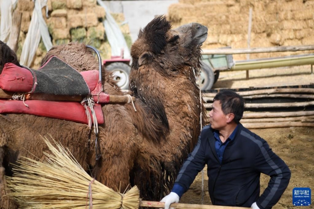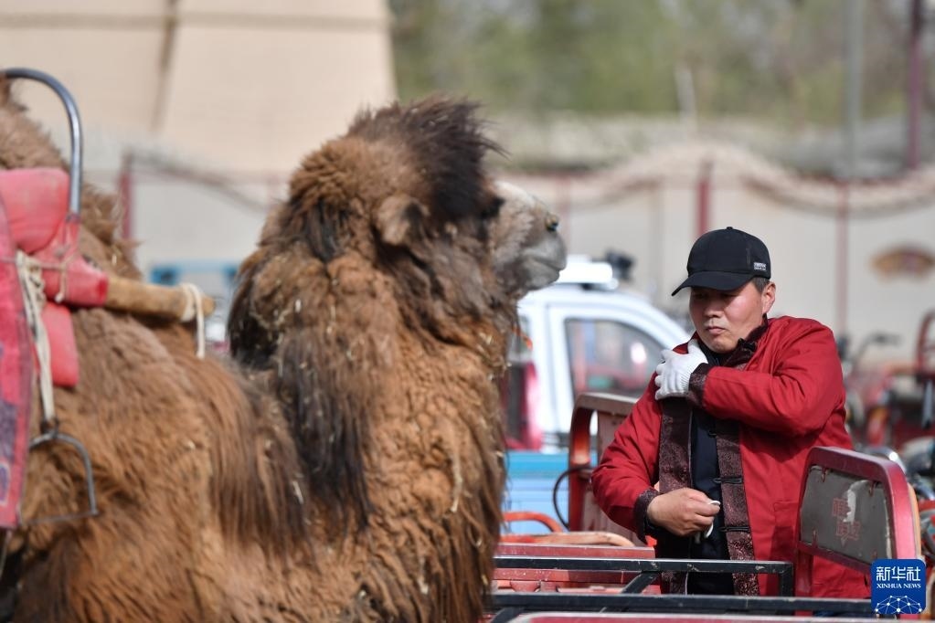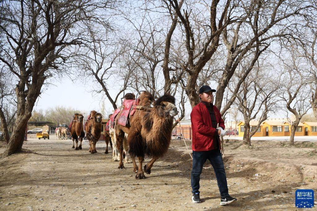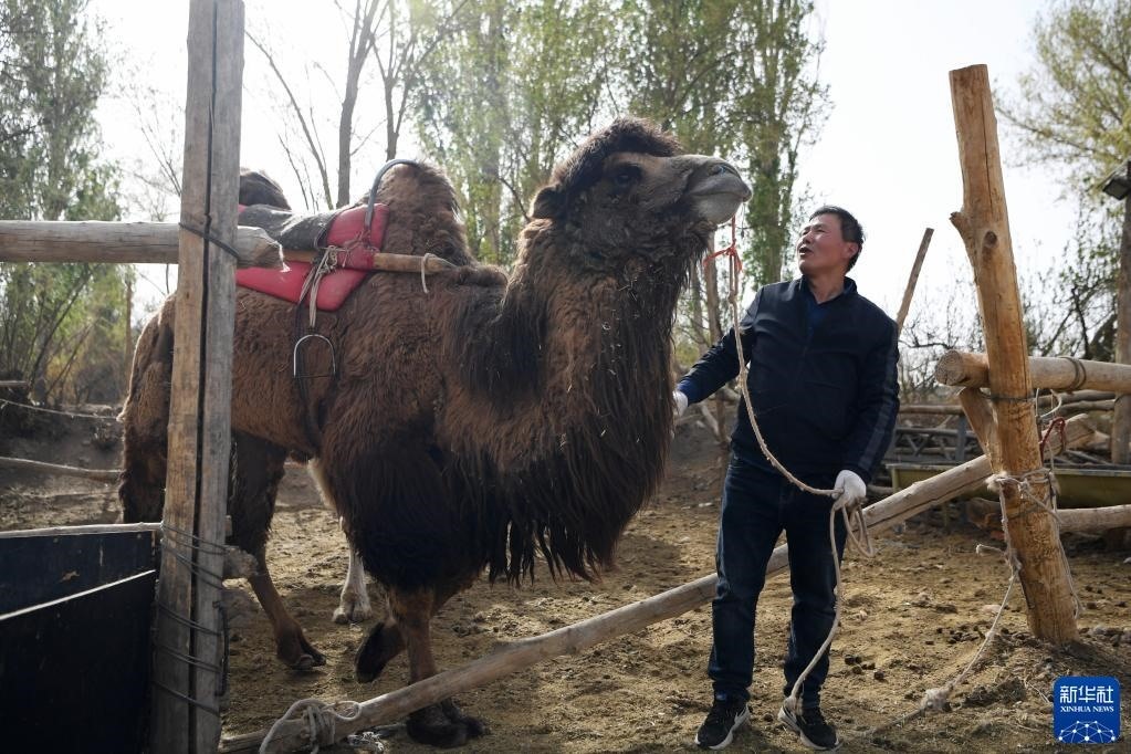 換上景區(qū)工作服的曹文華牽著駱駝準備“上班”(4月24日攝)。