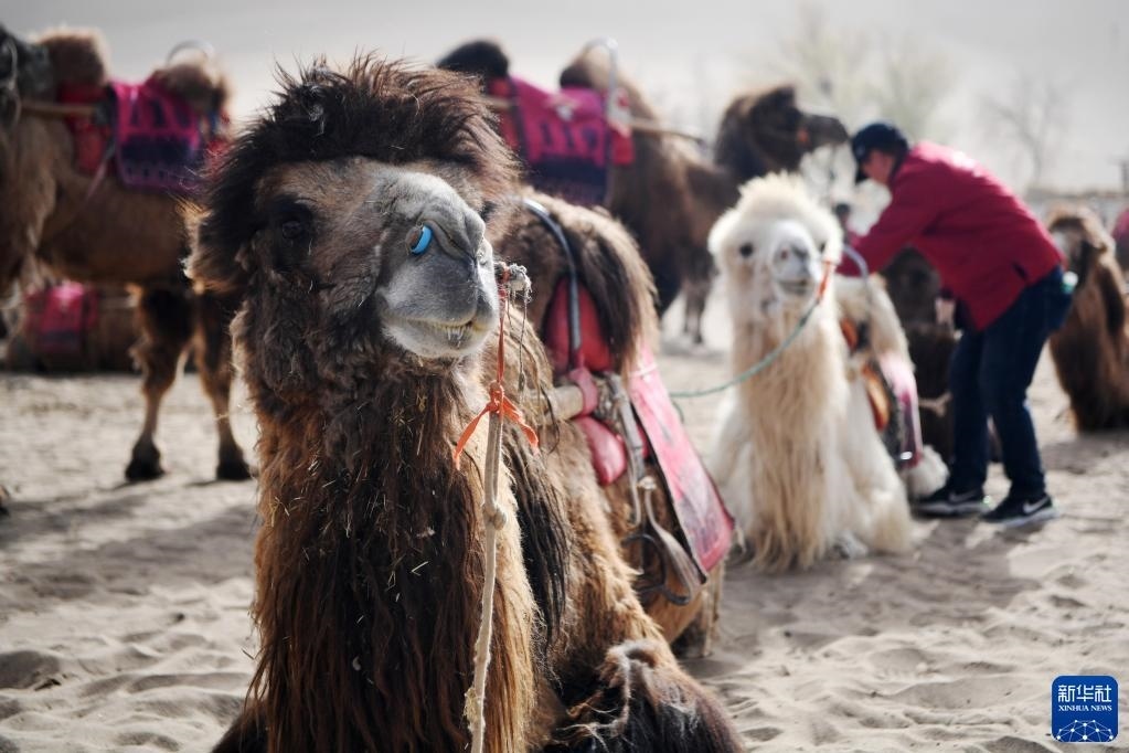 編號“414”的駱駝(前)在鳴沙山月牙泉景區(qū)駱駝騎乘點休息等待游客(4月24日攝)。
