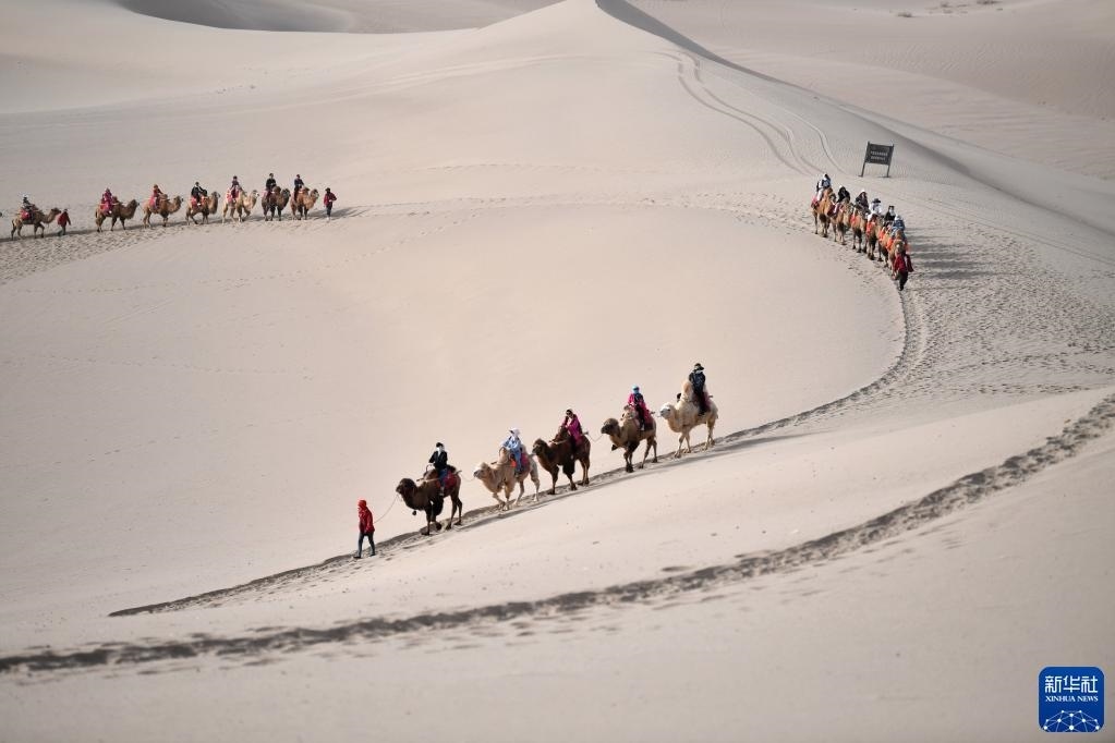 載著游客的駝隊行走在鳴沙山月牙泉景區(qū)(4月24日攝)。
