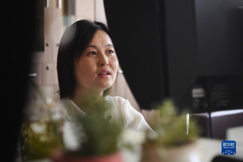 敦煌研究院文物數(shù)字化保護(hù)團(tuán)隊(duì)圖像處理人員年海麗從莫高窟照片墻前走過(4月25日攝)。