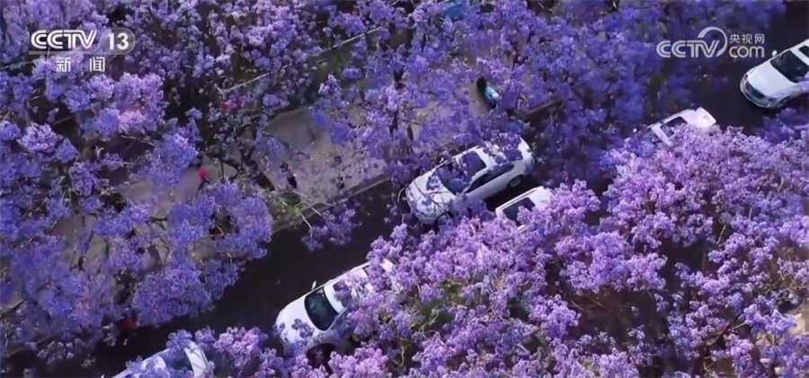 總臺記者 郭琳潔:我現(xiàn)在是在昆明的教場中路,5月上旬,道路兩側的藍花楹競相綻放,將這條1.4公里長的道路裝扮成一條紫色長廊。