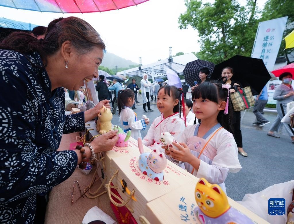 5月6日,居民在非遺集市展示手工藝品“半山泥貓”。   新華社記者 徐昱 攝