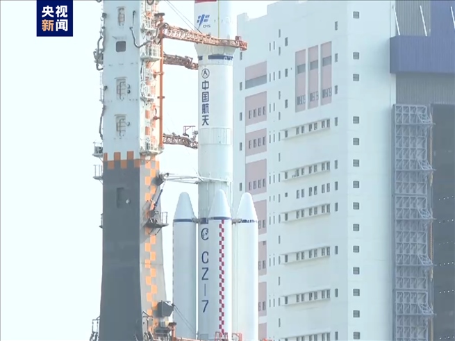 天舟六號(hào)船箭組合體進(jìn)行垂直轉(zhuǎn)運(yùn)