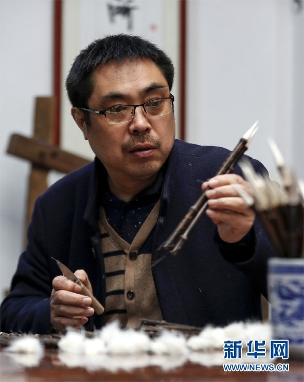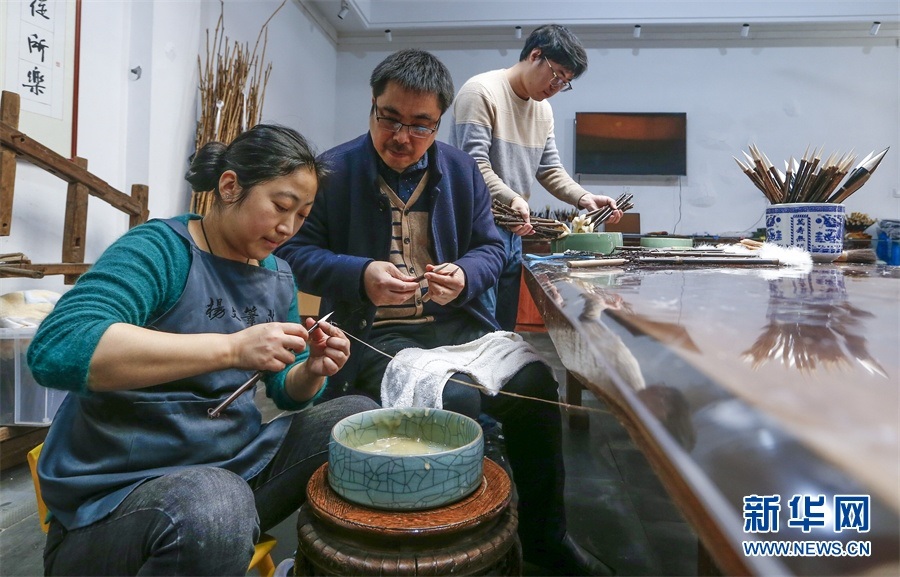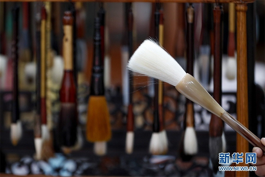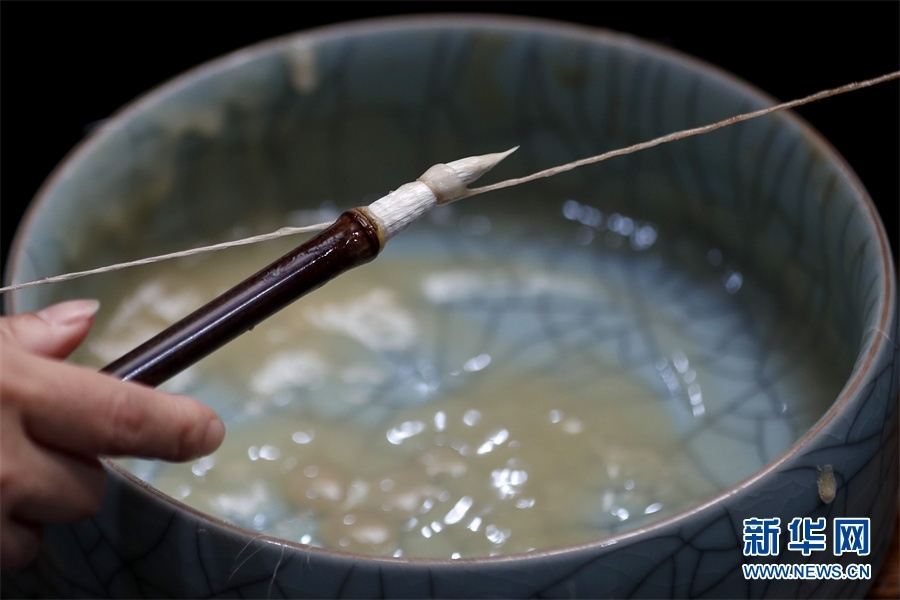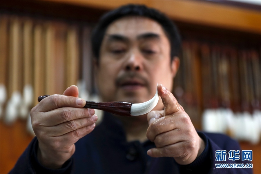 一支好的徽筆,不僅要保留傳統(tǒng)工藝,且要在原基礎上不斷創(chuàng)新、改良。楊文尤其重視書畫家對筆的使用反饋:“因為他們對用筆最挑剔,而且現(xiàn)代書畫家創(chuàng)作方式和作品不斷創(chuàng)新,對毛筆也有新的要求,他們提出的要求我總是盡力去滿足,也使得制筆技藝進一步得到了提高?!? 新華網(wǎng)發(fā)(施亞磊 攝)