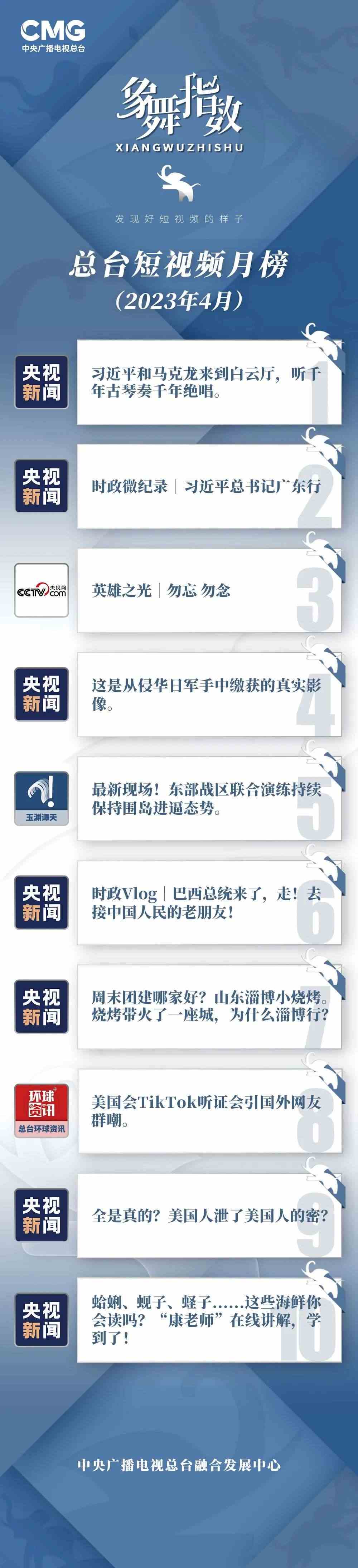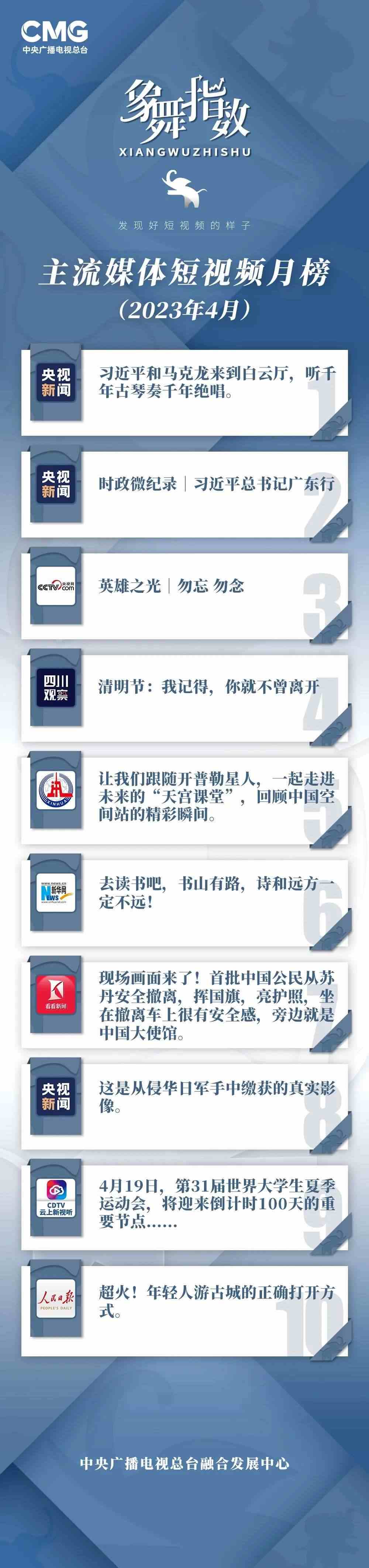 中央廣播電視總臺“象舞指數(shù)”評議品牌,推出主流媒體短視頻月榜、總臺短視頻月榜。在2023年4月,這些內(nèi)容引發(fā)大眾關(guān)注: