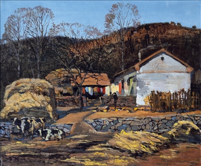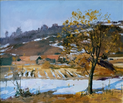 《激戰(zhàn)松骨峰》描繪的是抗美援朝戰(zhàn)爭(zhēng)中,中國(guó)人民志愿軍與美軍激烈廝殺的悲壯場(chǎng)面。作者從動(dòng)態(tài)型的構(gòu)圖與形象表層,把戰(zhàn)爭(zhēng)集團(tuán)之間的搏殺以濃重的筆調(diào)展現(xiàn)開(kāi)來(lái),表現(xiàn)了中國(guó)人民志愿軍英勇頑強(qiáng)、熱愛(ài)自由和勇于犧牲的精神,展示了歷史的悲劇性沖突。作者從沉甸甸的歷史中找到戰(zhàn)爭(zhēng)中最慘烈、最殘酷、最能表現(xiàn)人物悲劇性命運(yùn)的瞬間,用現(xiàn)實(shí)主義的創(chuàng)作手法,扎實(shí)、生動(dòng)地塑造了一個(gè)又一個(gè)志愿軍勇士的形象。硝煙籠罩著戰(zhàn)場(chǎng),鮮血與白雪融合成冰,敵我雙方,犬牙交錯(cuò),生死搏殺。同時(shí),也使我們感受到戰(zhàn)爭(zhēng)的殘酷與生命的脆弱。作者處理宏大的戰(zhàn)爭(zhēng)場(chǎng)面獨(dú)具匠心:陽(yáng)光透過(guò)硝煙,有節(jié)奏地營(yíng)造出戰(zhàn)場(chǎng)的空間;雪地上被間隔的藍(lán)色陰影,反襯出黃褐色的主調(diào)。作品對(duì)細(xì)部進(jìn)行了恰如其分的刻畫(huà),但又不失對(duì)整體宏觀(guān)的把握,厚重的色彩中透出熱情,樸拙的筆觸映著畫(huà)家的激動(dòng)。