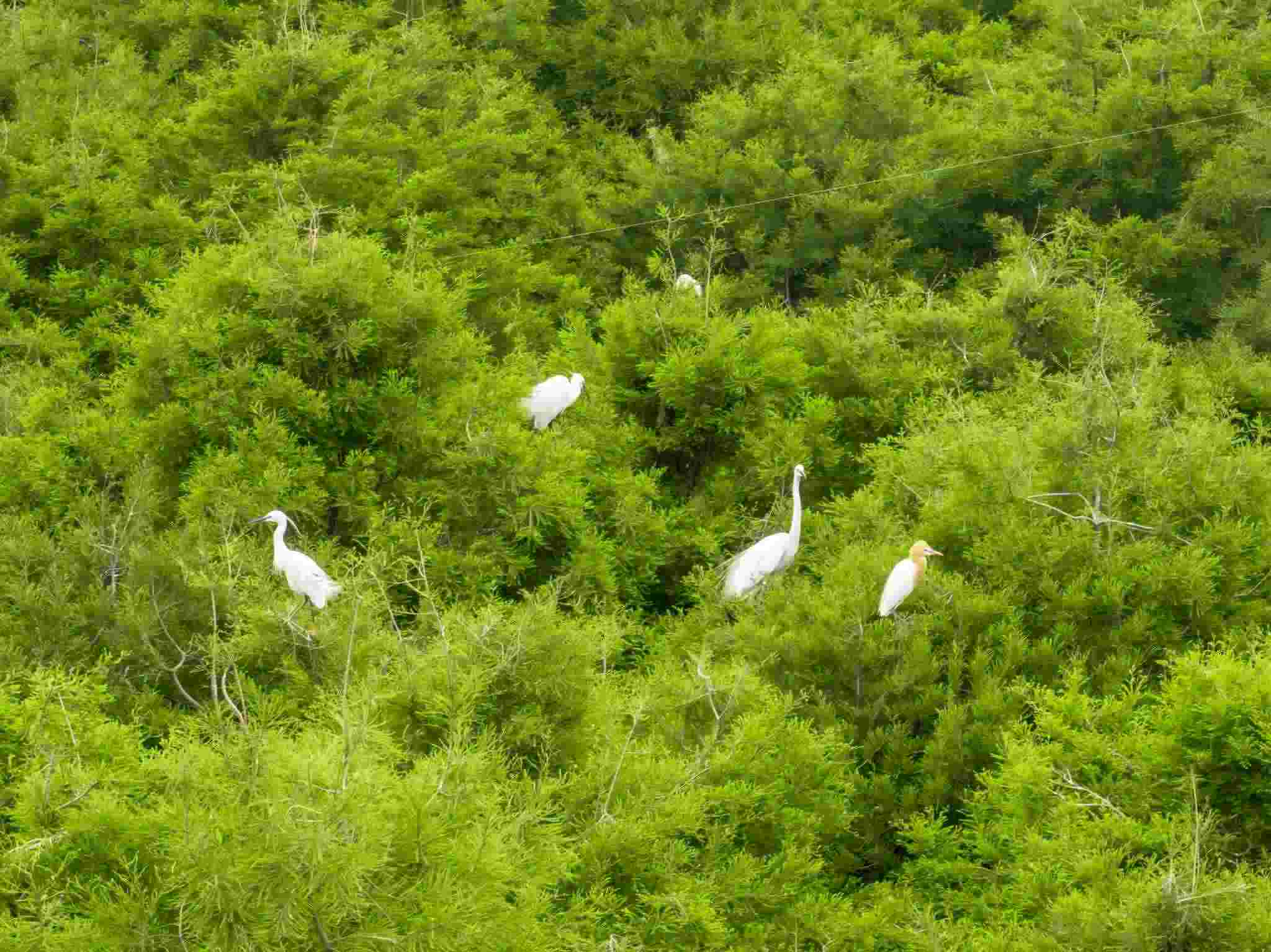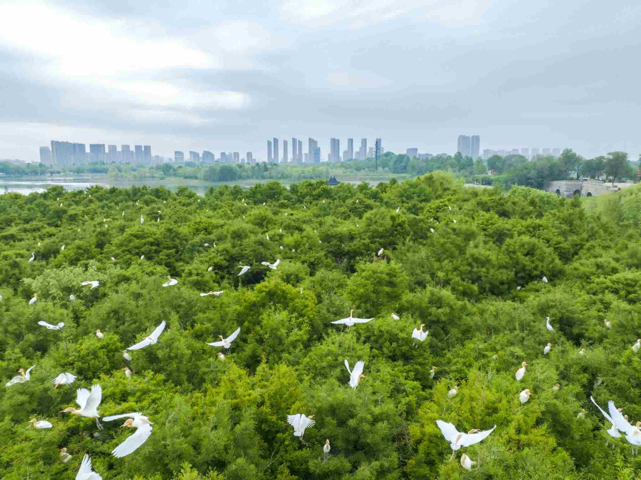 2023年5月11日,江蘇連云港,東海縣西雙湖濕地公園,上千只鷺鳥前來?xiàng)⒎毖?。視覺中國(guó)