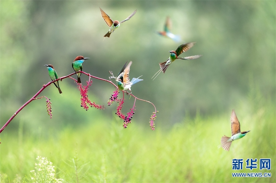 河南省信陽市新縣位于南北氣候過渡帶,地跨長江、淮河兩大流域,植被覆蓋率達(dá)95%,森林覆蓋率達(dá)76.7%。得天獨(dú)厚的自然生態(tài)環(huán)境,吸引了藍(lán)喉蜂虎、藍(lán)翡翠、戴勝等眾多鳥類在這里“安營扎寨”,繪出一幅生動和諧的自然畫卷。新華網(wǎng)發(fā)(闞敦傳 攝)