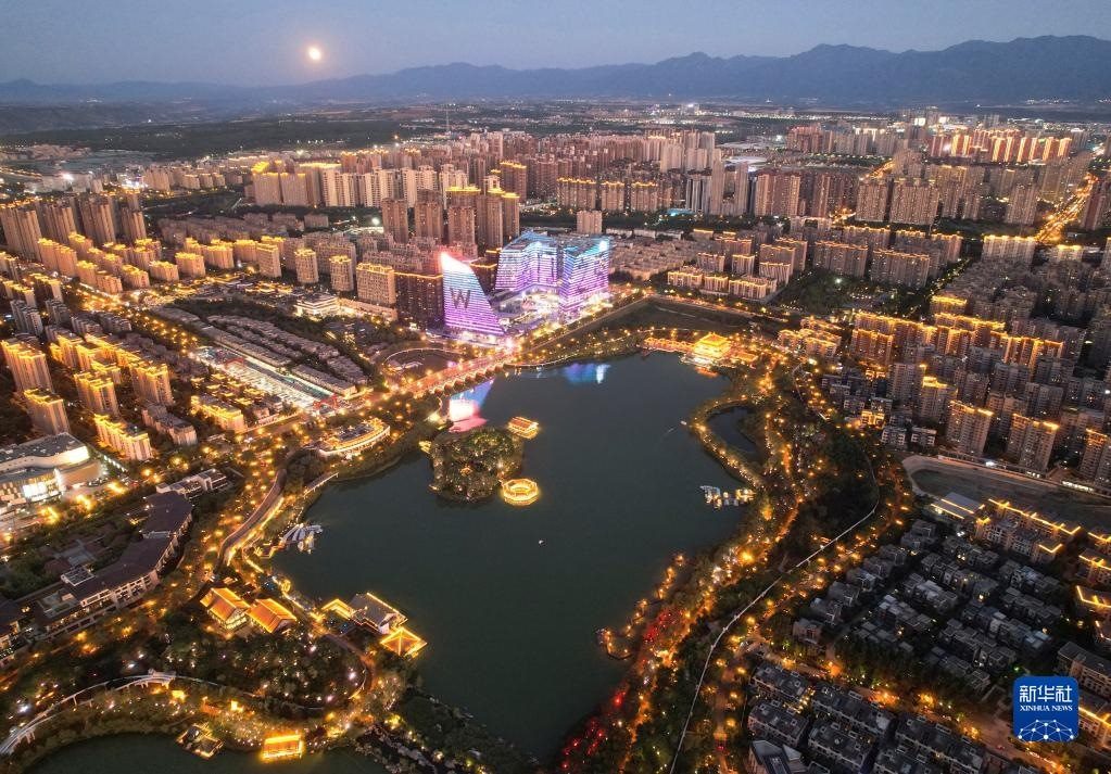 西安曲江新區(qū)日落時(shí)分的城市景色(2022年6月14日攝,無(wú)人機(jī)照片)。