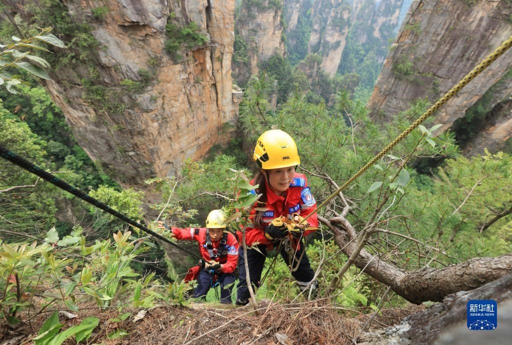 5月14日,張家界市武陵源區(qū)山地應(yīng)急救援隊(duì)隊(duì)員在天子山的絕壁間索降。