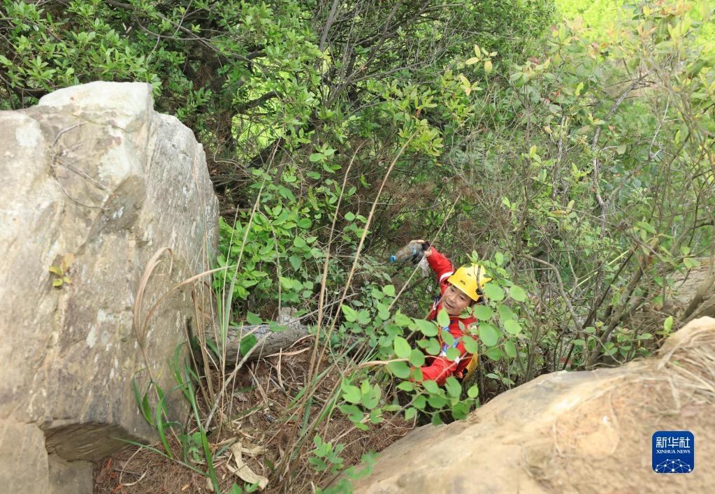 5月14日,張家界市武陵源區(qū)山地應(yīng)急救援隊(duì)隊(duì)員在叢林中撿拾垃圾。   新華社發(fā)(吳勇兵攝)