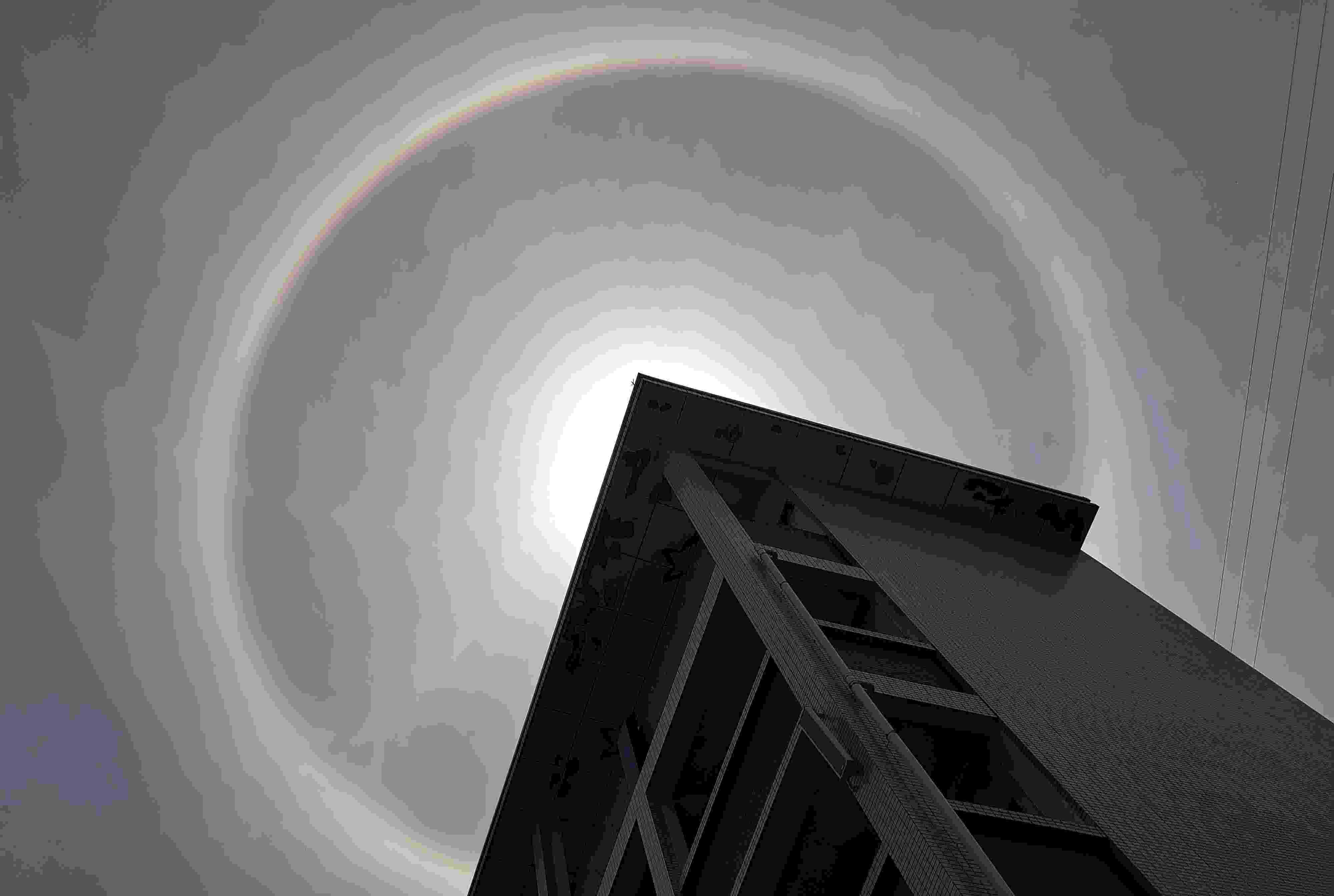 2023年5月15日中午,湖北宜昌,天空出現(xiàn)日暈景觀。當日,多地天空出現(xiàn)日暈。日暈是一種大氣光學現(xiàn)象,是太陽光通過云層中的冰晶折射或反射而形成的。 視覺中國