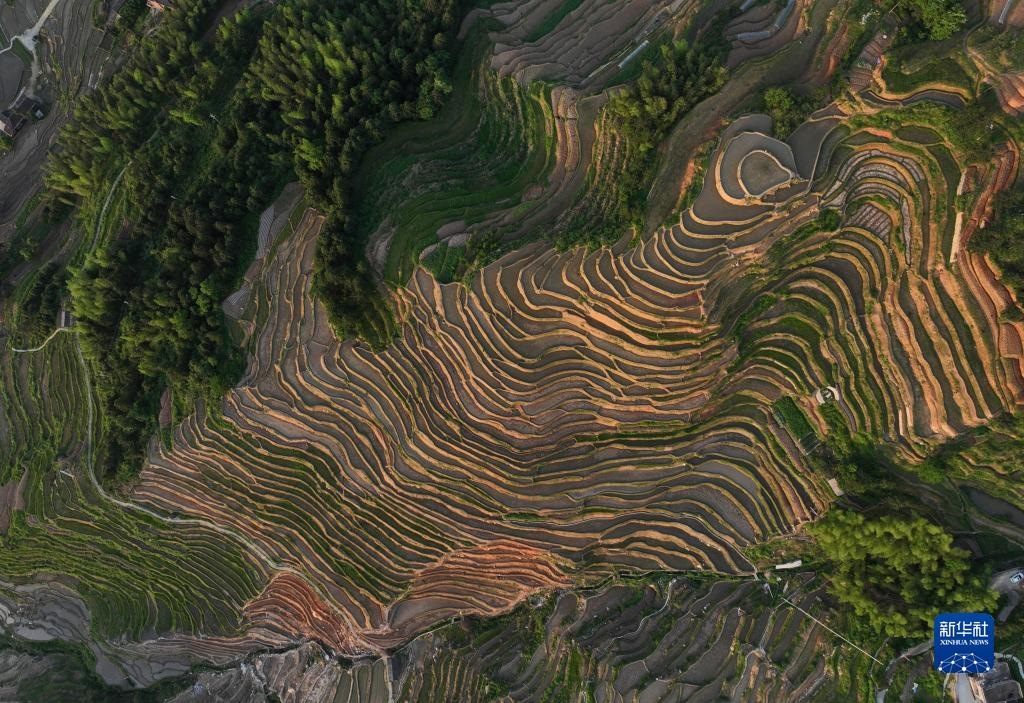 5月18日拍攝的晨光映照下的紫鵲界梯田(無人機(jī)照片)。