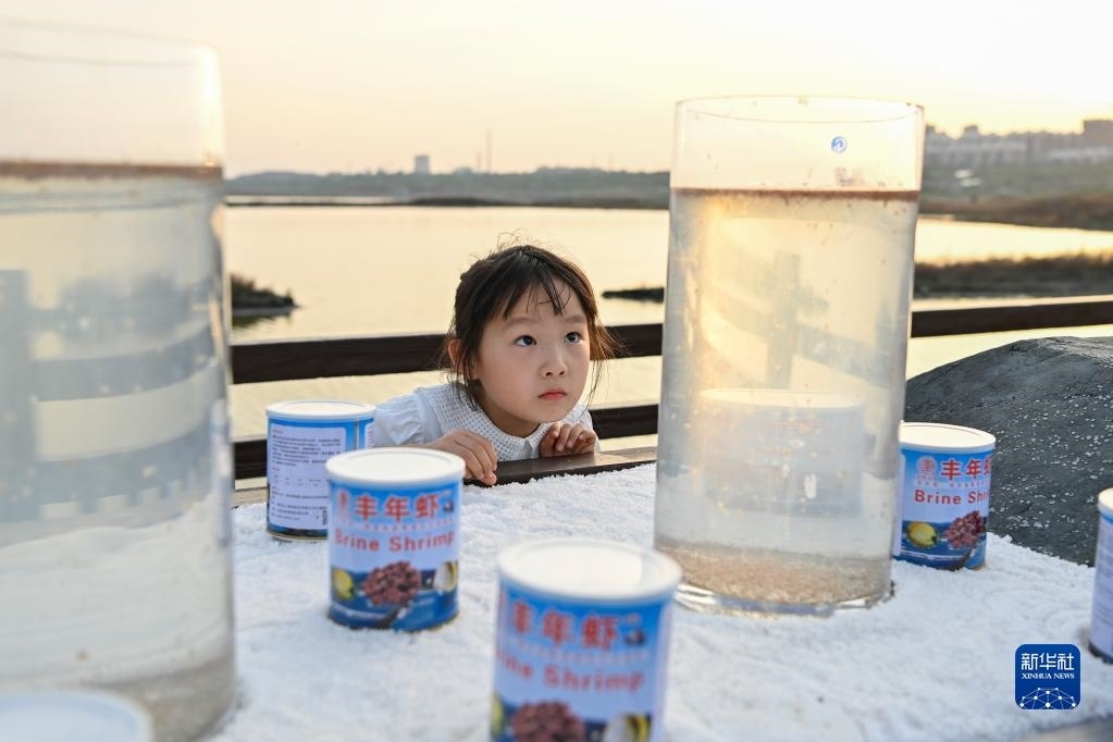 5月16日,小朋友在運(yùn)城鹽湖觀察展出的鹵蟲。   新華社記者 楊晨光 攝
